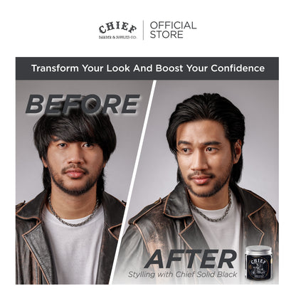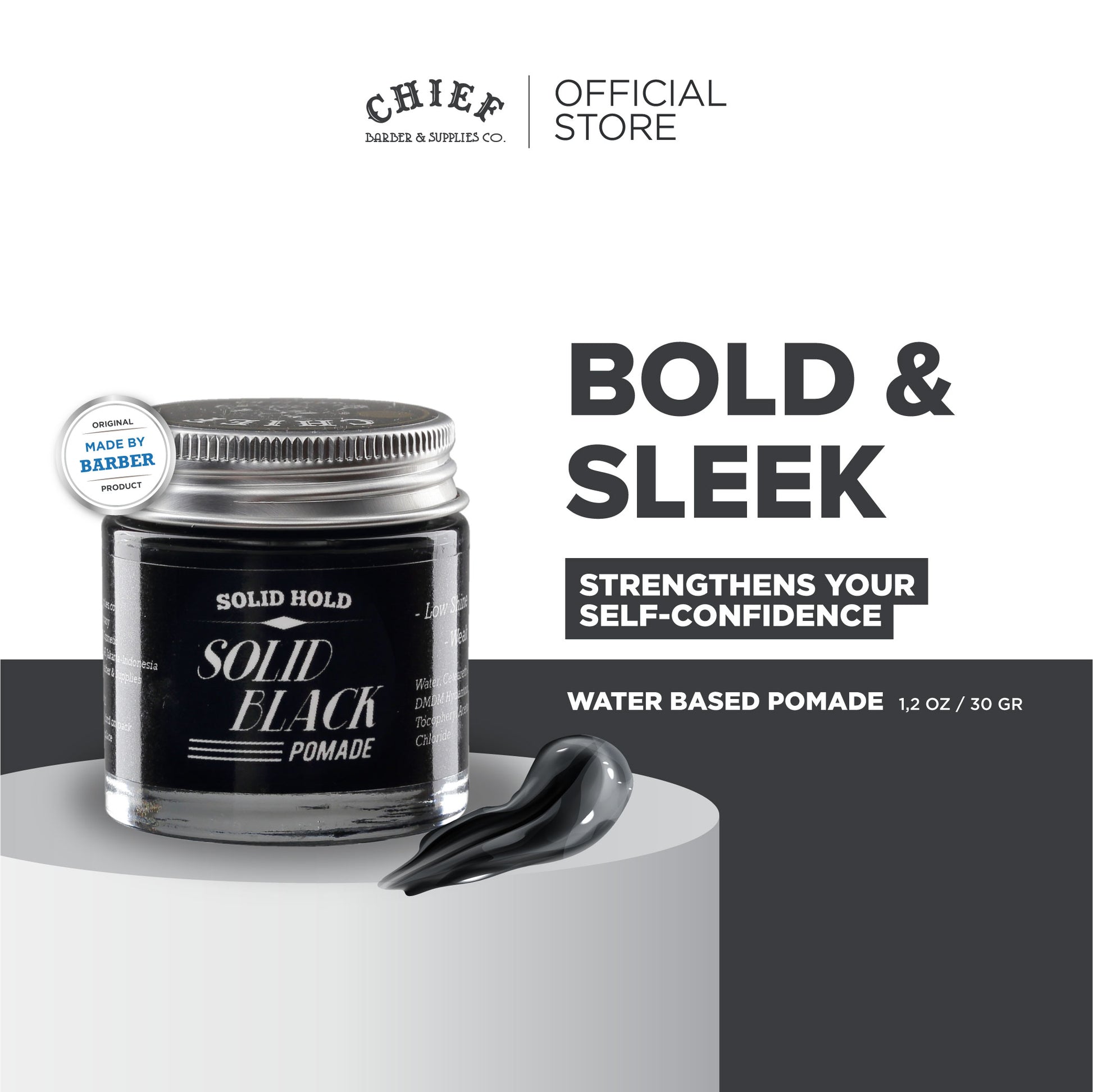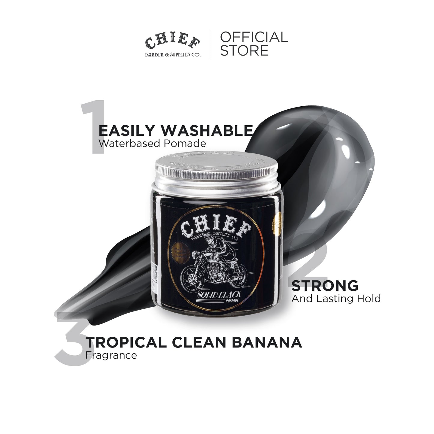 Chief Solid Black adalah pomade berbahan dasar air yang sangat tepat untuk aktivitas dalam ruang. Memiliki tingkat kekuatan dan kilau yang tinggi serta mengunci gaya rambut seharian dengan tingkat kekuatan yang bertambah di suhu ruang dingin. Performa penggunaan Chief Solid Black sangat mudah dibersihkan oleh air.
